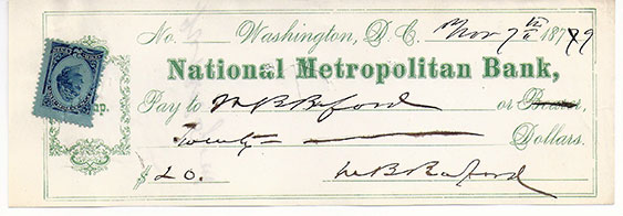 BUFORD, Napoleon Bonaparte (1807-1883). Union General served at the Battle of Vicksburg. Served mostly in Arkansas, Mississippi and Tennessee. D.S., Bank check, Washington, D.C., Nov.7, 1879. Made payable to himself for $20.00. Endorsed by him on the verso thus three signatures. Fine................ $145.00