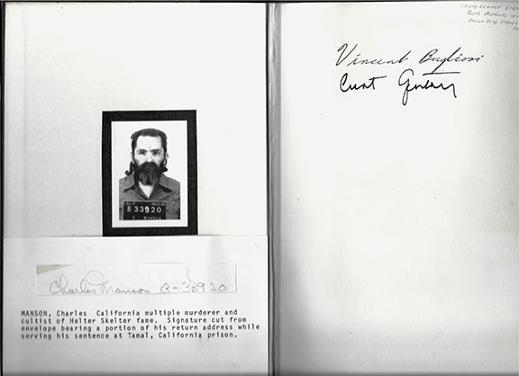 Rare Helter Skelter Signed GENTRY, Curt (1931-2014) American author and co-author of the 1974 true crime classic Helter Skelter. Helter Skelter, The True Story of the Manson Murders. W.W. Norton & Co. 1974, First Edition, First Printing. Five hundred two pages with illustrations. The front free endpaper is signed by Vincent Bugliosi and Curt Gentry, Inside the front cover is a slip signed in pencil, “Charles Manson B-32920” Cover and corners in fine condition, some wear to gold lettering on the spine. Very scarce to find this book signed....................SOLD ![]() |