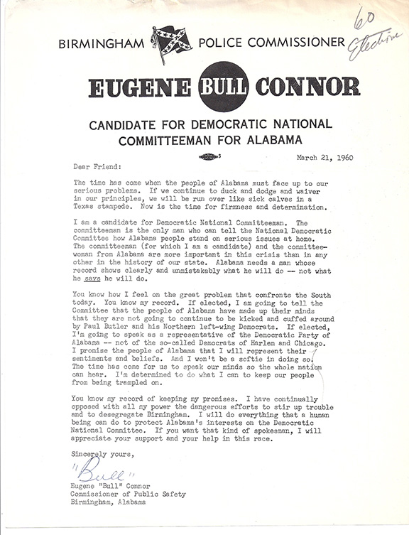 CONNOR, Eugene “Bull” (1897-1973). Democratic party politician. Police official for the City of Birmingham, Alabama during the Civil Rights Movement. He fought against integration using fire hoses, police dogs and a small tank against protest marchers. This spectacle of brutality was broadcast on national television. He was part of history, on February 16, 1968, he was present at the Haleyville, Alabama Police Station for the first ever use of 9-1-1 as an emergency telephone number. RARE typed letter signed on his Birmingham Police Commissioner, Eugene “Bull” Connor letterhead illustrating the Confederate Flag. March 21, 1960. A fabulous content campaign letter. In part: “The time has come when the people of Alabama must face up to our serious problems. If we continue to duck and dodge and waiver in our principals, we will be run over like sick calves in a Texas stampede....The Committeeman for which I am a candidate and the committeewoman from Alabama are more important in this crisis than in any other in the history of our state. Alabama needs a man whose record shows clearly and unmistakably what he will do--not what he says he will do...You know how I fell on the great problem that confronts the South today...people of Alabama have made up their minds that they are not going to continue to be kicked and cuffed around by Paul Butler and his Northern left-wing Democrats….I’m determined to do what I can to keep our people from being trampled on...I have continually opposed with all my power the dangerous efforts to stir up trouble and to desegregate Birmingham...” Signed “Bull”. In fine condition................SOLD