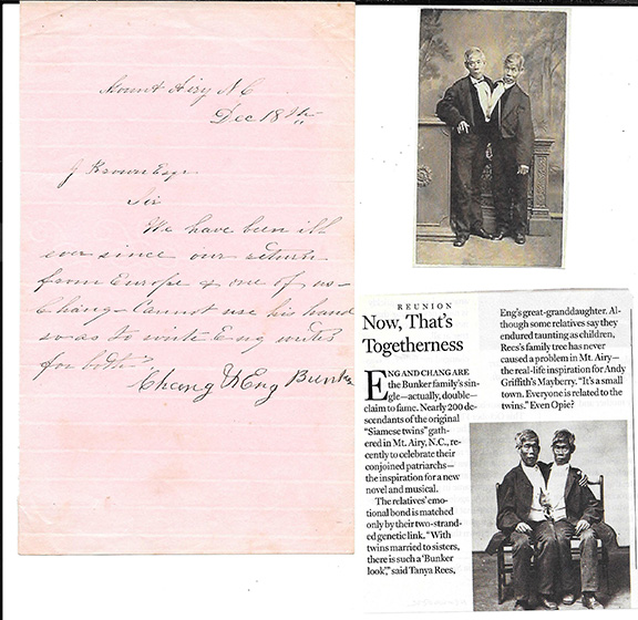 BUNKER, Chang & Eng (1811-1874). The original Siamese Twins, joined at the waist. They were Chinese and were discovered swimming in Siam by an American. They traveled to the United States and Europe beginning in 1929. They married Sarah and Adelaide Yates with whom they had 22 children between the two. Chang and Eng died in 1874 at the age of 63. Chang preceded Eng in death by about two and a half hours. An autopsy indicated Chang died of a blood clot in the brain and indications are that Eng died of shock. Manuscript letter signed, Mount Airy, N.C., Dec. 18th (n.y.). To J. Brown. They write: “We have been ill ever since our return from Europe and one of us-Chang-cannot use his hand so as to write. Eng writes for both, Chang & Eng Bunker.” From the noted collection of John Brown, Jr. The Bunker’s are scarce in any form and quite rare in letter form. In fine condition along with a portrait of the Bunker’s and a magazine article about a Bunker family reunion........SOLD