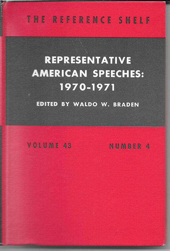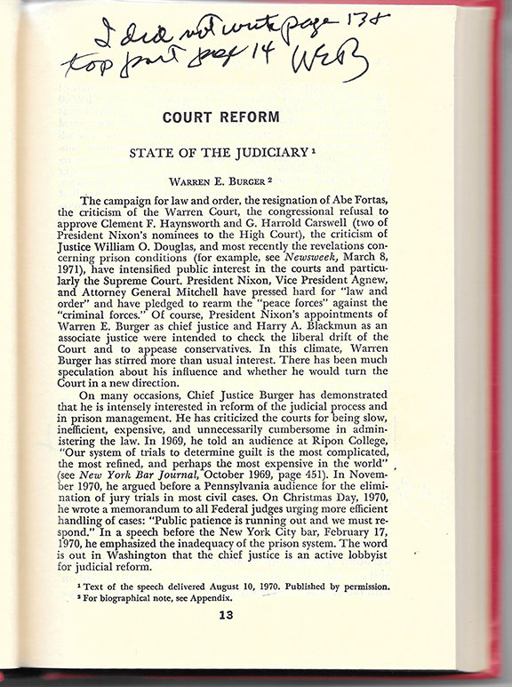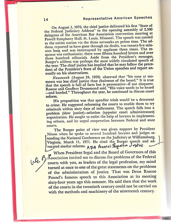 BURGER, Warren E. (1907-1995). Nominated by President Richard Nixon and served as the 15th Chief Justice of the United States from 1969 to 1986. Representative American Speeches; 1970-1971. Edited by Waldo W. Braden, New York: The H.W. Wilson Company 1971. One hundred fifty-three pages, hardcover. Affixed to inside the front cover is the Ex Libris bookplate of Warren E,. Burger. On page 13, Burger writes: “I did not write page 13 & top part page 14 W.E.B.” On page is an additional note in Burger’s hand and signed once again with his initials. A most unusual collectors item for anyone collecting items signed by a Chief justice. In fine condition...............$150.00