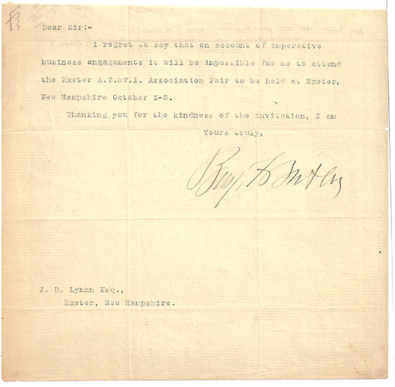 BUTLER, Benjamin (1818-1893). Union Major general called “The Beast”. Controlled occupied New Orleans and commanded the Army of the James. T.L.S., no date to J.D. Lyman, Exeter, New Hampshire. Regrets because of Imperative business engagement it will be impossible for him to attend the Exeter A.T.&T. I. Association Fair and sends thanks for the invitation. Signed with a very large signature. A fine example........................ $225.00 |