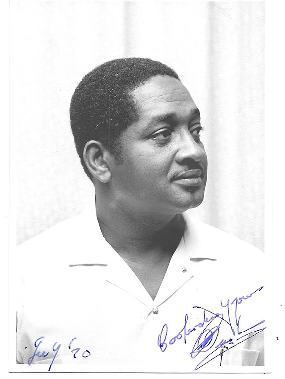 BURNHAM, Forbes  (1923-1985). Dictator and strongman. Prime Minister of Guyana (1964-1980). President of Guyana (1980-1985).  Photograph, B&W, 4”x6”. head and shoulders pose.  Signed with a two word sentiment, dated in his hand as Prime Minister “July ‘70.”  Not a common signature...