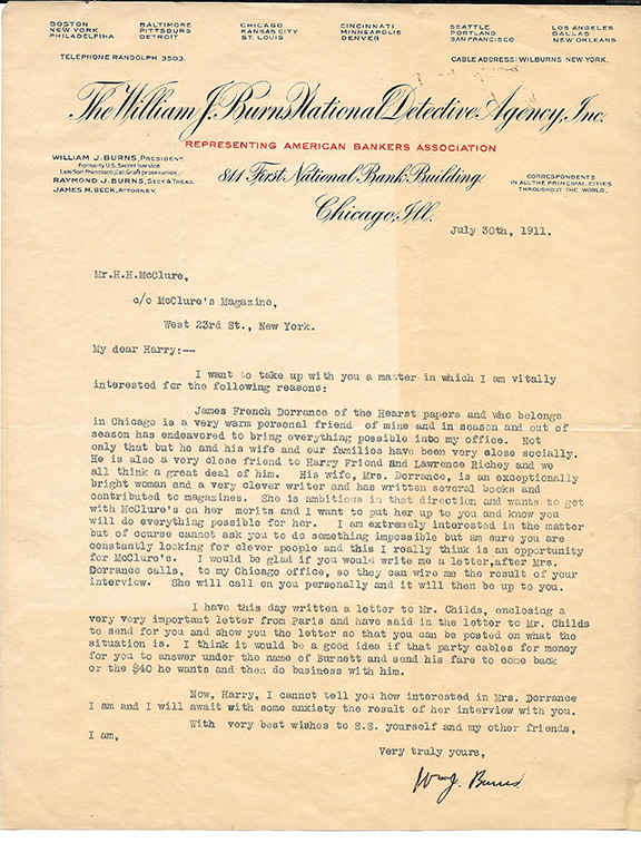 BURNS, William J. (1861-1932). American detective. Director of the Bureau of Investigation, U.S. Department of Justice (1921-24) (predecessor of the FBI). Founder and President of Wm. J. Burns detective Agency. Detective magazines published “true” crime stories based on his exploits. Typed letter signed, one page, on his ornate name imprinted stationery, July 30, 1911 to Mr. H. McClure of McClure’s Magazine. A very interesting letter asking that a close friend be interviewed for a job and asking for the results of that interview... ” Now Harry, I cannot tell you how interested in Mrs. Dorrance I am and I will await with some anxiety the result of her interview with you.” Some minor wear along a corner otherwise in V/G to fine condition. A rather scarce autograph in any form............... $275.00
