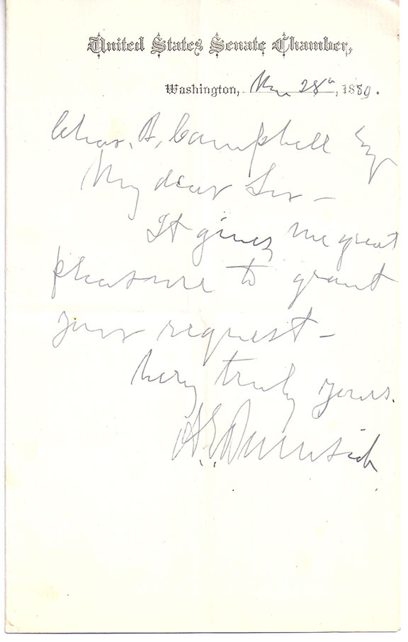 BURNSIDE, A.E. (1824-1881). Union General who allowed Lee’s escape at Antietam. As head of the Army of the Potomac he saw it crushed at Fredericksburg. Governor of Rhode Island. Autograph letter signed, on the imprinted U.S. Senate Chamber, Washington stationery. May 28, 1880. Fine one page example. Burnside writes: “it gives me great pleasure to grant your request.” Fine large signature.....................SOLD |