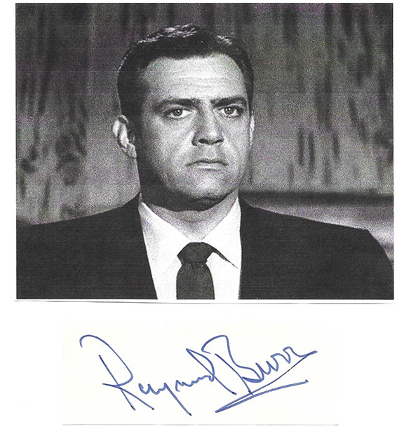BURR, Raymond (1917-19930. Canadian, gay actor who had a lengthy Hollywood career. Best known for his TV series Perry Mason and Ironsides. Choice signature on a slip with ample margins for framing..................$37.50