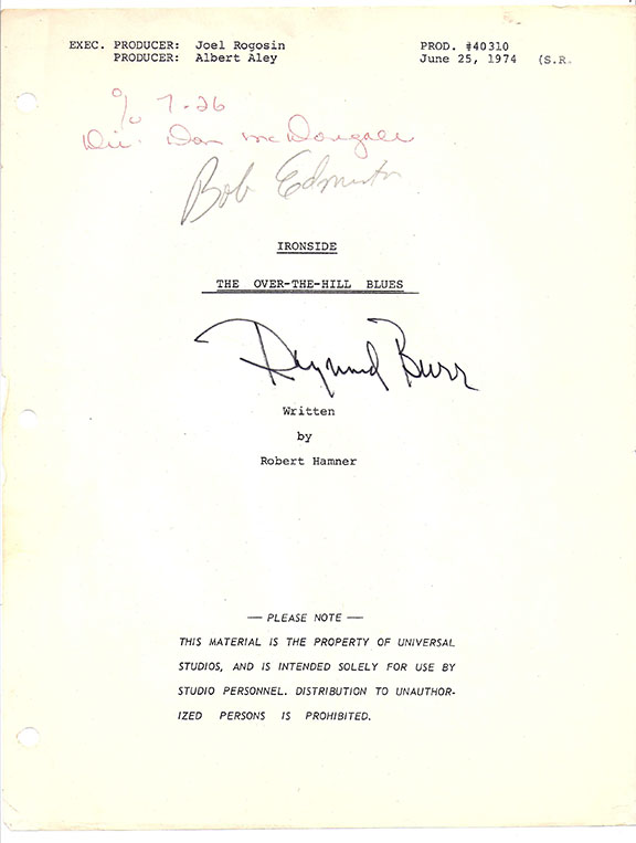 Production # 40310, June 25, 1974. Boldly signed by Raymond Burr. In addition it appears two others have signed one being Don McDougall (1917-1991) Director of Ironside and dozens of other TV series such as Rin Tin Tin, Dukes of Hazzard, Amazing Spider Man, Wonder Woman, Dallas, Planet of the Apes and more. In fine condition and very uncommon as such................... $135.00
