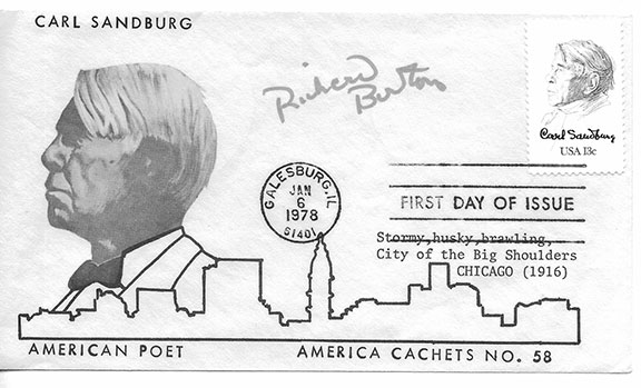 BURTON, Richard (1925-1984). Welsh actor, stage, and cinema actor, appeared in over 40 movies and had 7 Academy Award nominations. He was the highest paid actor in the world. Married to Elizabeth Taylor. First Day Cover commemorating Carl Sandburg. Cachet of a profile of Carl Sandburg, affixed is a USA 13 cent Carl Sandburg postage stamp cancelled Galesburg, IL First Day of Issue, JAN 6 1978. Boldly signed “Richard Burton” in red ink. In fine condition.....................$175.00![]() |