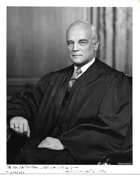 BURTON, Harold H. (1888-1964). American Jurist, Mayor of Cleveland, Ohio. Associate Justice of the U.S. Supreme Court (1945-1958). Choice 8”x10”, B&W, Harris & Ewing photograph of the Justice, half length pose dressed in his judicial robe. Inscribed to a noted autograph dealer. “To David Battan with best wishes from Harold H. Burton , October 16, 1959.” In near fine condition..............................$135.00 |