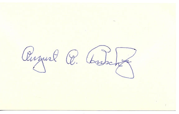 BUSCH, August A. (1899-1989). American brewing magnate who built the Anheuser-Busch companies into the largest brewing company in the world by 1957. He helped revive St. Louis in the 50’s by donating $5 million toward the construction of Busch Memorial Stadium. In addition, he purchased the St. Louis Cardinals. He is likely to be inducted into the Baseball Hall of Fame. Choice and quite scarce is his full signature on a 3”x5” card. In very fine condition.....$350.00 |