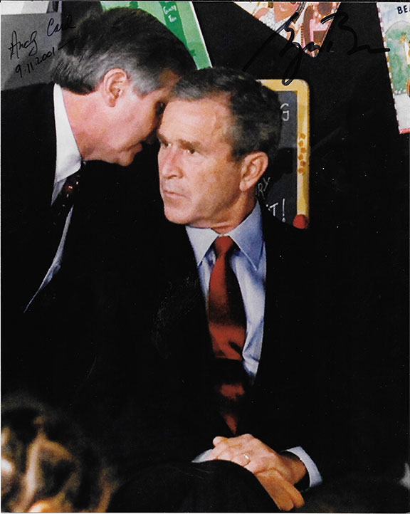 CARD, Andy 1947- ) 21st White House Chief of Staff. Served under President George W. Bush. Color photograph 8”x10” of Andy Card whispering into the ear of President George W. Bush in a Florida school on 9/11/2001. Card is saying: “A second plane hit the second tower, America is at war.” This is the iconic photograph of Andy card breaking the news to President Bush on 9/11. Boldly signed “George W. Bush” and Card has signed his name adding: “9.11.2001.” This photograph signed by both can be considered very scarce. In mint condition................................SOLD ![]() |