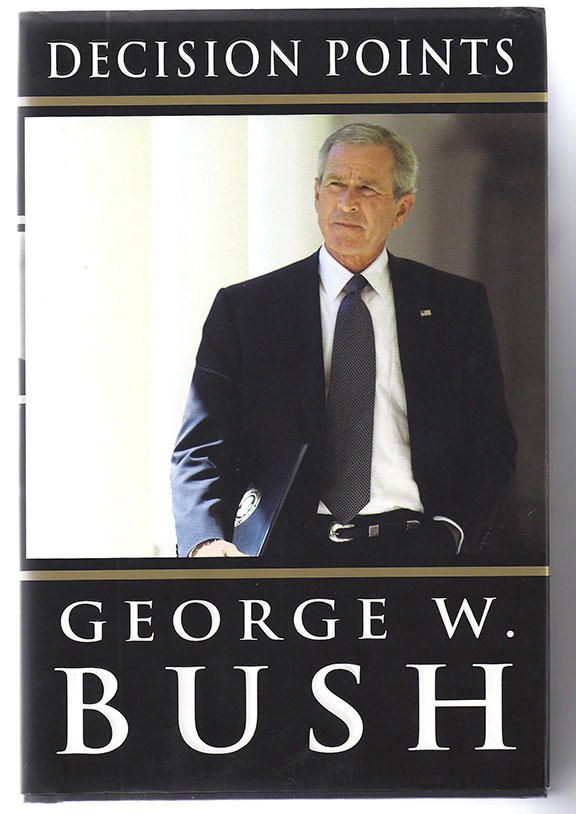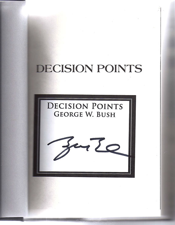 BUSH, George W. (1946- ) 43rd President of the United States. His book: Decision Points. Crown Publishers, 2010, First Edition, 497 pages with illustrations. Affixed to the half title page is Bush’s bookplate made especially for this book. The bookplate is hand signed by George W. Bush with a signature second to none. Book is in “as new” condition with the dust jacket...........$125.00 |