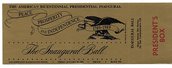 BUSH, George H.W. (1924- ) Forty first President of the United States. Original ticket to the January 20, 1989 Inaugural Ball, President’s Box. The two ticket stubs have not been removed. Full tickets to this Inaugural Ball are very scarce. In excellent condition.................$47.50 |