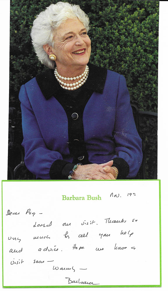 BUSH, Barbara (1925-2018) First Lady (1989-1993) and wife of President George H.W. Bush. Second Lady serving from 1981-1989). Mother of President George W. Bush and Jeb Bush, Governor of Florida. America’s only First Lady who gave birth to a U.S. President. Uncommon autograph letter signed on her name engraved card, Nov.19th, Dear Peg (LeBaron) Loved our visit. Thanks so very much for all your help and advice. Hope we have a visit soon-Warmly- Barbara.” In excellent condition...........$115.00