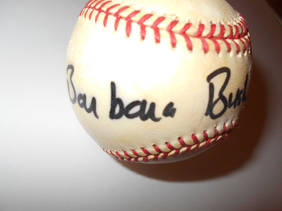 BUSH, Barbara (1925-2018). First Lady of the United States (1989-1993). Married to George H.W. Bush (1945-2018). Net worth 25 million dollars. Official Ball, American League, Bobby Brown, President. A huge dark bold signature “Barbara Bush” is on the sweet spot. Ball lightly toned otherwise in very good condition. Not common on baseballs....................SOLD
