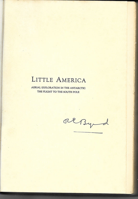 BYRD, Richard E. (1888-1957). Aviator, polar explorer who claimed to reach both poles by air. Medal of Honor recipient and a descendant of Pocahantas. Little America, Aerial Exploration in the Antarctic, The Flight to the South Pole. G.P. Putnam’s Sons, 1930, First Edition. Four hundred twenty-two pages with illustrations. Signed on the half title page. In V/G condition with light splitting to inside of rear spine...........$75.00 |