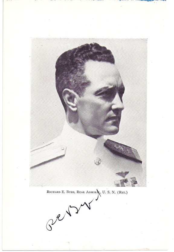 BYRD, Richard E. (1888-1957). American naval officer, explorer and pioneer aviator. Best known for his explorations of the North and South Pole. He claimed to have been the first to reach the North and South Poles by air. Recipient of the Medal of Honor. Portrait, head and shoulders pose in Naval uniform. Overall size. 7”x9” very boldly signed. Not common in signed portraits......................... $245.00 |