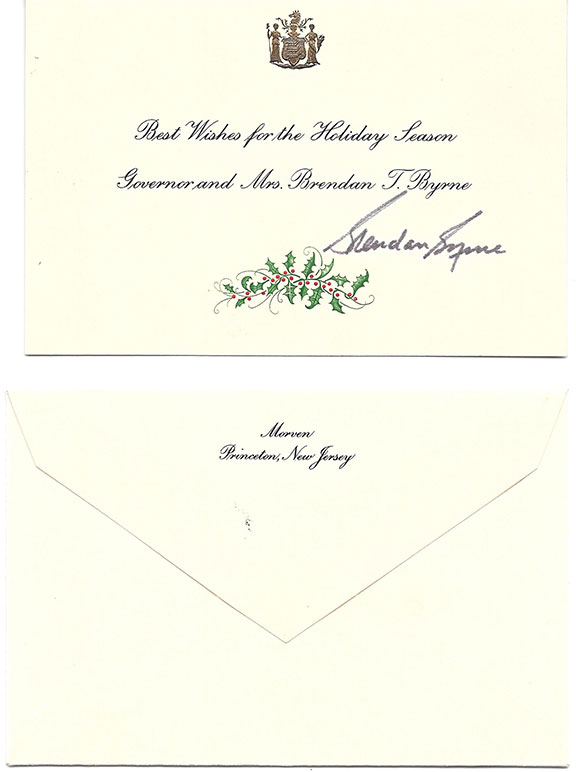 BYRNE, Brendan (1924- ) Governor of New Jersey (1974-82), responsible for the development of the Meadowlands Sports Arena, named for him. His Holiday Greeting card as governor. Gold embossed seal of New Jersey with the printed message: “Best Wishes for the Holiday Season, Governor and Mrs. Brendan T. Byrne”. Hand signed by Brendan Byrne. With original envelope..............$17.50