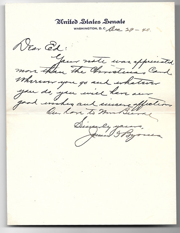 BYRNES, James F. (1879-1972). Nominated to the U.S. Supreme Court by President Franklin D. Roosevelt in June 1941. He resigned this position after serving for only 15 months. Very scarce autograph letter signed, one page on United States Senate letterhead dated Dec. 29, 1940. To Dear Ed. Byrnes writes: “Your note was appreciated more than the Christmas Card. Wherever you go and whatever you do, you will have our good wishes and sincere affections. Our love to Mrs. Burne. Sincerely yours, James F. Byrnes.” Handwritten letters by James F. Byrnes can be considered quite uncommon. A choice example............ $275.00