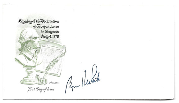 WHITE, Byron (1917-2002). Associate Justice of the Supreme Court appointed in 1962. Played for the Detroit Lions (1940-41). Played with the Pittsburg Pirates and led the NFL in rushing yards. Unused FDC commemorating the signing of the Declaration of Independence. Signed in full. In very fine condition........... SOLD |
