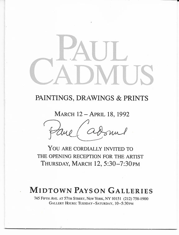 CADMUS, Paul (1904-1999). He was an American artist. He is best known for his egg tempera paintings of gritty social interactions in urban settings. He also produced many highly finished drawings of single nude male figures. His paintings combine elements of eroticism and social critique in a style often called magic realism. His paintings are on display in most major museums. Quality 6-page invitation, in color, for the Midtown Payson Galleries in New York. Celebrating an exhibition of Cadmus major and current works. Also, he will be present for a book signing. March 12-April 18, 1992. Hand signed by Paul Cadmus on the cover of the invitation. Very fine condition.......$95.00