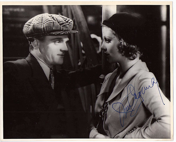 CAGNEY, James (1800-1986). American film actor winner of the Academy Award. Known as a tough guy. Best remembered for his role as George M. Cohan in the 1942 classic Yankee Doodle Dandy. Movie still of Cagney along with a female actress, 8”x10”, B&W, half length pose, signed “James Cagney”...................... SOLD |