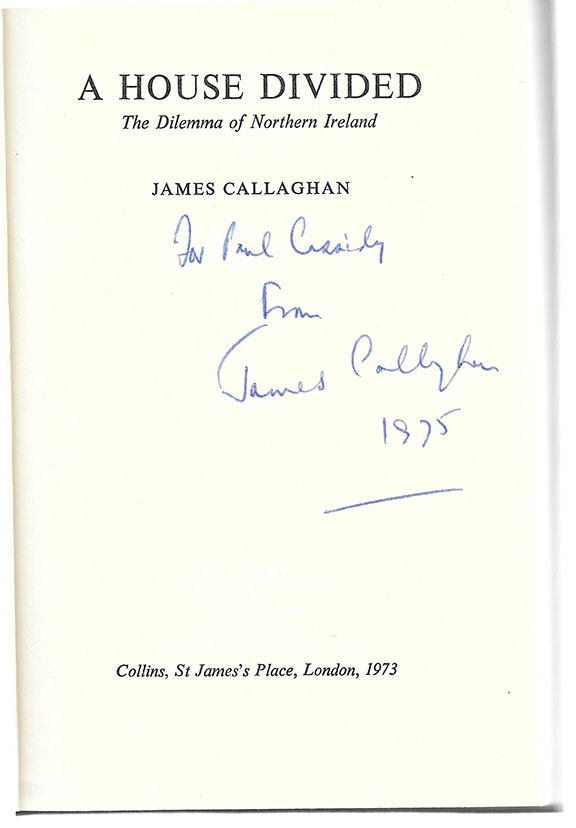 CALLAGHAN, James (1912-2005). British politician, only person to serve in all four of the “Great Office of State.” Chancellor of the Exchequer (1964-67), Home Secretary (1967-70), Foreign Secretary (1974-76) and Prime Minister (1976-1979). His book: “A House Divided, The Dilemma of Northern Ireland.” William Collins Sons, London, 1973, First Edition. Two hundred seven pages. Inscribed, signed and dated “1975”on the title page. In fine condition with the dust jacket......95.00![]() ![]() |