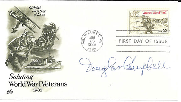 CAMPBELL, Douglas.  (1896-1990)  Popular American WW1 Ace. Flew with the 94th Aero Sqdn.  Credited with 6 victories. Fine WW1 Veteran’s F.D.C. with a nice printed WW1 cachet. Veteran’s WW1 postage stamp cancelled First Day of Issue at Milwaukee on Aug. 26, 1985. Boldly signed