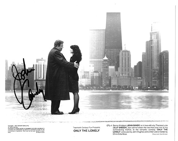 CANDY, John  (1950-1994). One of Canada’s greatest and funniest character actors. Known as a big-hearted buffoon.  Movie Still (1988) from the film “Who’s Harry Crumb.”   Black and white, 8”x10” of Candy standing with Ally Sheedy from the movie “Only The Lonely” (1991). Boldly signed.  Quite uncommon having a genuine autograph.................$450.00