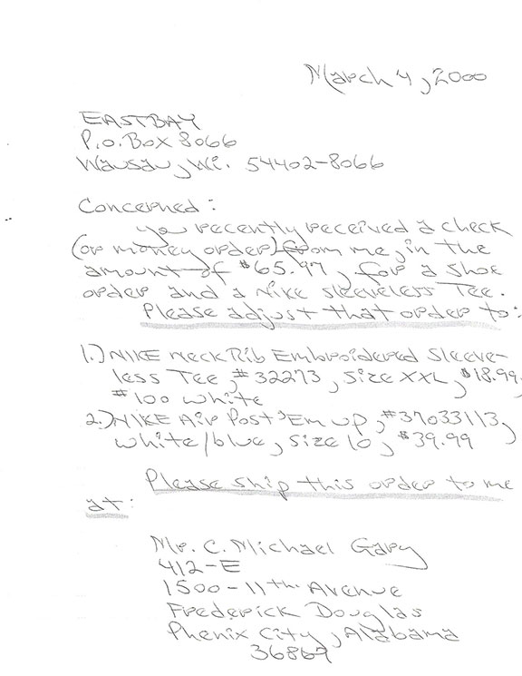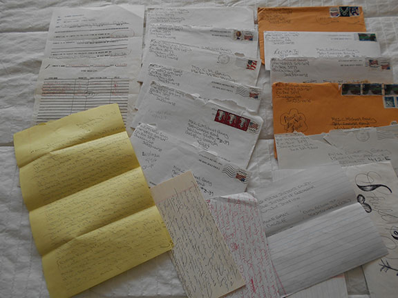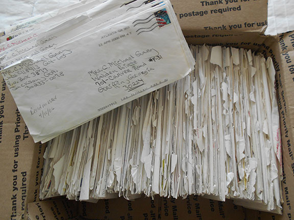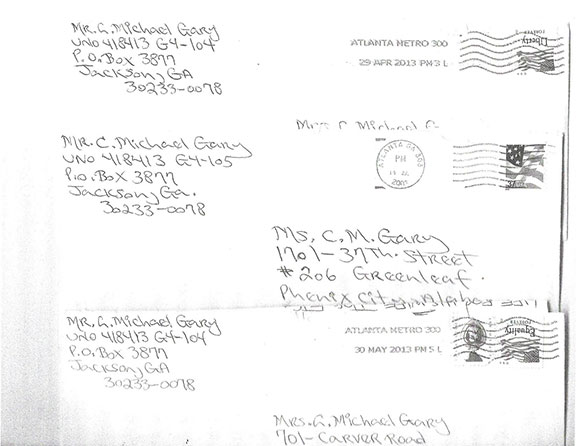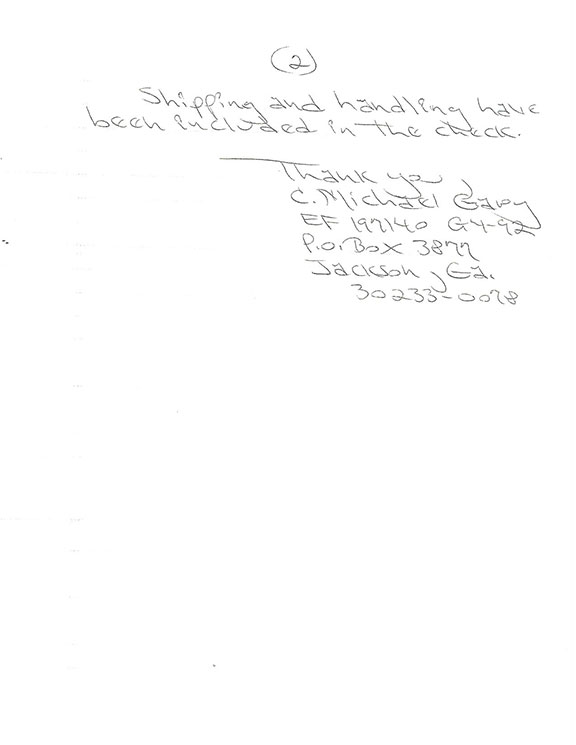 Offered is a huge collection of handwritten letters, paintings, drawings, handmade knitted dolls, legal documents, etc, Most everything is written to his girl friend who later in the correspondence became his wife. Included are approximately 258 letters totaling about 794 pages. He signs his name about 30 different ways including Papa, your spanker, your baby, Tasty lover, C. Michael, Carlton, hubby and more. Content covers every subject imaginable between a man on death row and his wife. Some topics are: wanting single edge razor blades, stealing white boys food, finding a large shank, shakedowns, homosexuals putting things up their butts, surgery, disciplinary reports, his guard being gay, inmate killing himself, inmates about to strike as man on death row is murdered, wants to sell his watch, ring and cross being afraid of being murdered and so very much more. There are surprises like legal letters and more. Most if not all of Gary’s letters include the original envelope which basically contains two of his full signatures. His writing is easily readable, see a few illustrations below. The entire collection.........SOLD