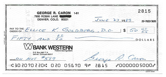 CARON, George R. (1919-1995). Tail Gunner on the Enola Gay. The only person on the plane to see and photograph the Atomic Bomb blast over Hiroshima. His check, Bank Western, June 27, 1985 made payable to his dentist Ellice K. Goldberg for $50.00. Signed: “George R. Caron.” ..............$47.50![]() |