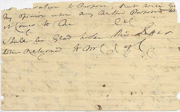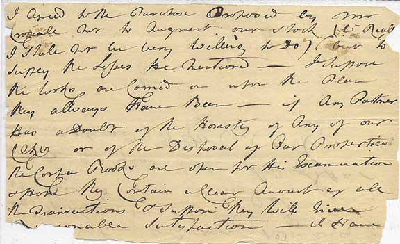 CARROLL, Charles (of Carrollton) (1737-1832). Signer of the Declaration of Independence from Maryland. Member of the Continental Congress. Autograph letter signed, two pages. Interesting content, this letter signed twice with his usual initials. This letter refers to the sale of some stock, however it appears the buyer questions or has some doubt about Carroll’s honesty. A few small pieces missing from three corners affecting a few words otherwise in good condition......$550.00