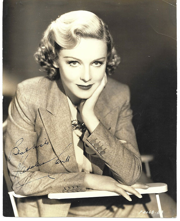 CARROLL, Madeleine (1906-1987). British star of the 1930’s and 40’s. She appeared in 39 Steps (1935) and The Prisoner of Zenda (1937). At the peak of her career she was the highest paying actress in the world. Stunning photograph, 7”X9”, half length pose with a slight smile. Signed:“Best wishes Madeleine Carroll.” In fine condition ...........$175.00![]() |