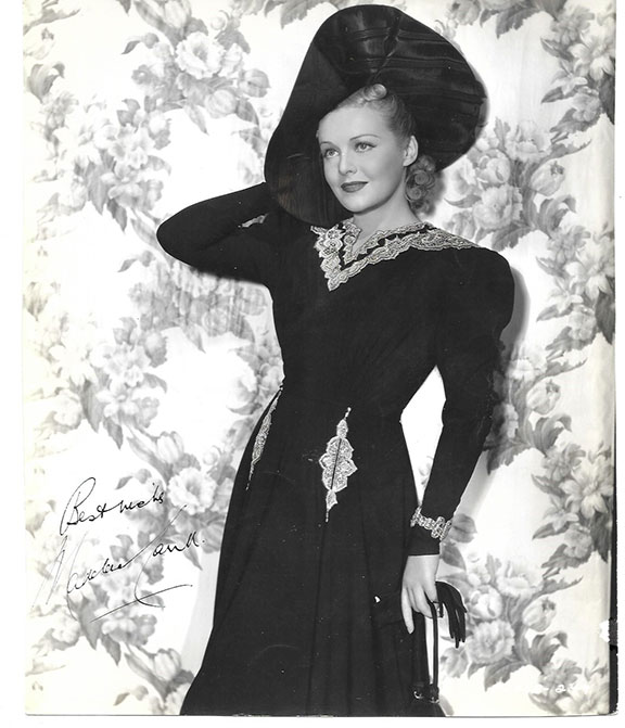 CARROLL, Madeleine (1906-1987). British star of the 1930’s and 40’s. She appeared in 39 Steps (1935) and The Prisoner of Zenda (1937). At the peak of her career she was the highest paying actress in the world. Stunning photograph ,7.5”x9”, three quarter length pose smiling. Dressed in a formal afternoon gown. A heavy black crepe dress designed by Edith head. Signed with a two word sentiment; “Best wishes Madeleine Carroll.” V/G-Fine condition...........$167.50![]() |