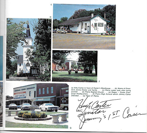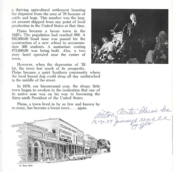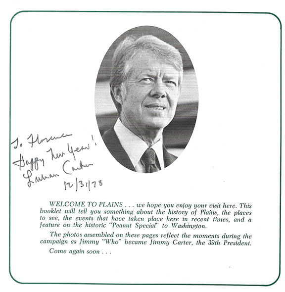 CARTER, Alton (Died 1/19/1978) Oldest member of the Carter family CARTER, Hugh (1920-1999) First cousin of Jimmy Carter, U.S. Senator CARTER, Amy (1967- ) Daughter of Jimmy Carter] CARTER, Billy (1937-1988) Younger brother of Jimmy Carter Wonderful pamphlet Plains Georgia Home of President Jimmy Carter. Twelve pages in color, covers the history and places, events and a section “The Peanut Special.” Inside the last page is a map of Plains, Georgia. Inscribed and signed and dated by Lillian Carter, signed Alton Carter Plains, Ga 12.31.77. Jimmys uncle 89 years (signed two weeks before his death), signed Hugh Carter Senator Jimmy’s 1st Cousin, signed by Billy Carter in front of his gas station, and signed by the young Amy Carter standing with her mother and father. In very fine condition and possibly unique ..................................$125.00 ![]() ![]() ![]() ![]() ![]() |