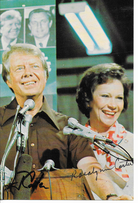 10. CARTER, Jimmy and Rosalynn Carter Postcard color photograph (1976) of Jimmy and Rosalynn Carter in front of several microphones. Measures 4”x6” and signed J. Carter and Rosalynn Carter. In very fine condition...........$145.00 |