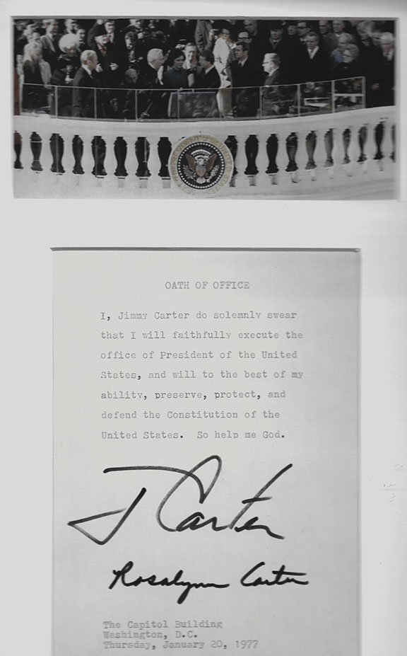 Typed document signed, The Capitol Building, Washington, D.C. Thursday, January 20, 1977. One page, measures appx. 6”x8”. The Presidential Oath of Office very boldly signed by J. Carter and Rosalynn Carter. Both signatures are unusually large. Matted along with a color portrait of Jimmy Carter being administered the Presidential Oath of Office. Overall size 11”x14”. From a distinguished collection of rare Presidential Oath’s of Office. In excellent condition...........$750.00