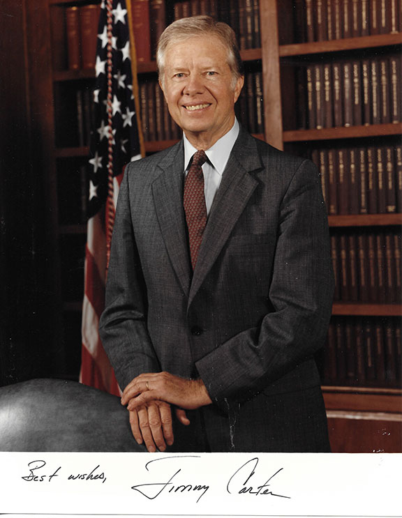 17. CARTER, Jimmy Fabulous color photograph, 8”x10” half length pose smiling with many books in the background. On the lower white margin, he has signed his name in full adding a two word sentiment. Extremely nice vintage example...........$175.00 |