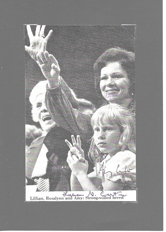 2. CARTER, Rosalynn, Lillian Carter and Amy Carter, Portrait of the three waving their hands in celebration. 3.5”x5” signed by all three. Rosalynn’s signature mostly in the dark portion of this print...........$95.00 |