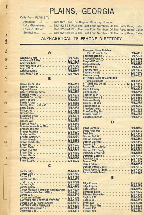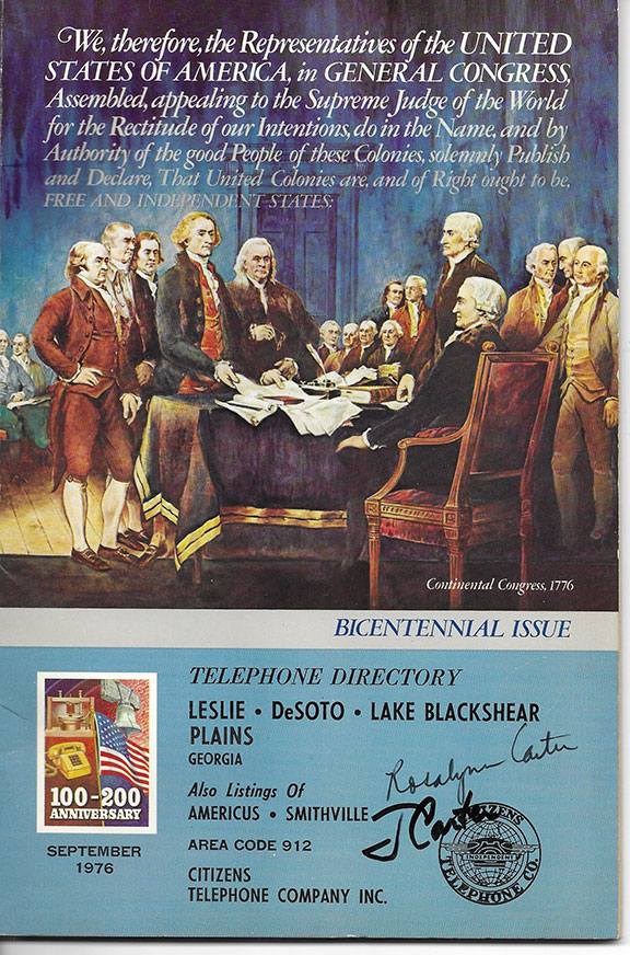 20. CARTER, Jimmy and Rosalynn Carter. Plains Georgia and the area Telephone Directory, Bicentennial Issue, September 1976. On page 16 lists some of the phone numbers of the Carter Family and Billy’s Service Station. Also included is the phone number for the Carter/Mondale Campaign Headquarters. In the Yellow pages there is listings for the Carter’s Worm Farm and Billy Carter’s Service Station. Signed on the cover with in-person signatures of J. Carter and Rosalynn Carter. In very good to fine condition. Possibly one of a kind.....$395.00