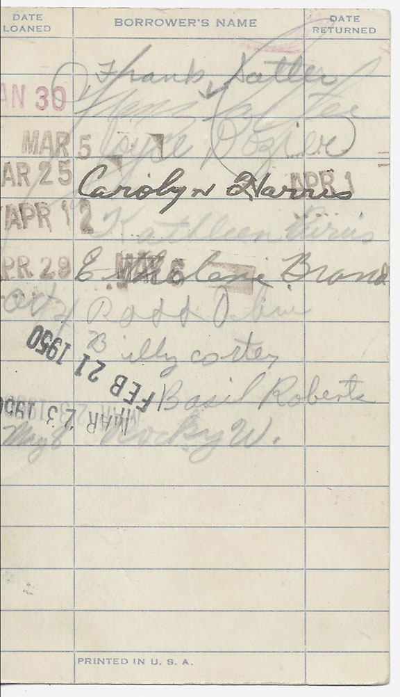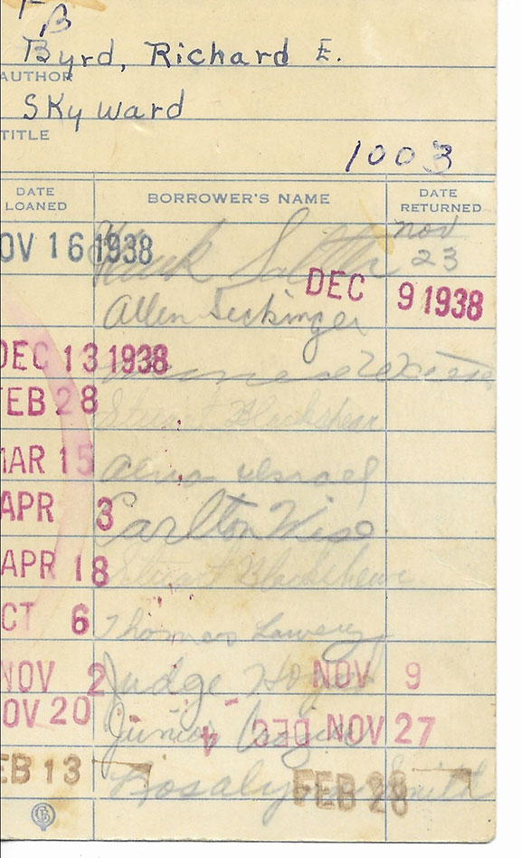 25. CARTER, JAMES (Jimmy), SMITH, Rosalynn CARTER) and Billy Carter Rare library card from the Plains High School Building. The town library was located inside. This card was for the book SKYWARD , Richard E. Byrd is the author. Most signatures from the students that took out the book are in pencil. The first date the book was loaned out was on Nov. 16, 1938. At the very bottom of the front of this card is signed Rosalynn Smith (later Carter) date she took out the book was February 13 (1940). Second from the top of the back of the card is signed “James Carter” (Jimmy). Date loaned Jan 30 (1941). Third from the bottom is signed Billy Carter. Date loaned Feb 21 1950. James Carter signed this card when he was 17 years old. Rosalynn was only 13 years old and Billy was only 13 years old. Jimmy Carter received his diploma in 1941, Rosalynn graduated valedictorian in 1944. Billy Carter is best known as the unruly president’s brother and also noted for the Billygate Scandal. The school was built in 1921 and closed its doors in 1979 and was transformed into a museum. This is the first time we have handled something signed as James Carter and also a first signed as Rosalynn Smith. A presidential treasure ..................................$850.00