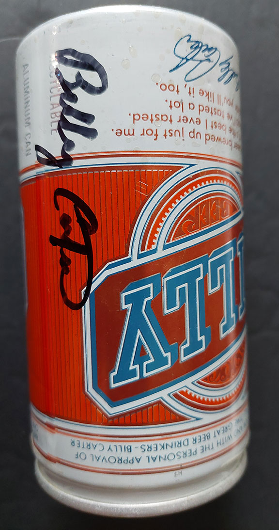 26 Carter, Billy. Original aluminum can of Billy Beer. Printed quote at bottom center: “I had this beer brewed up just for me. I think it’s the best I ever tasted. And I’ve tasted a lot. I think you will like it too. Billy Carter.” Boldly hand signed by Billy Carter on the side of the can. In V/G condition except for a small hole at the bottom of the can to drain the beer...........$85.00 |