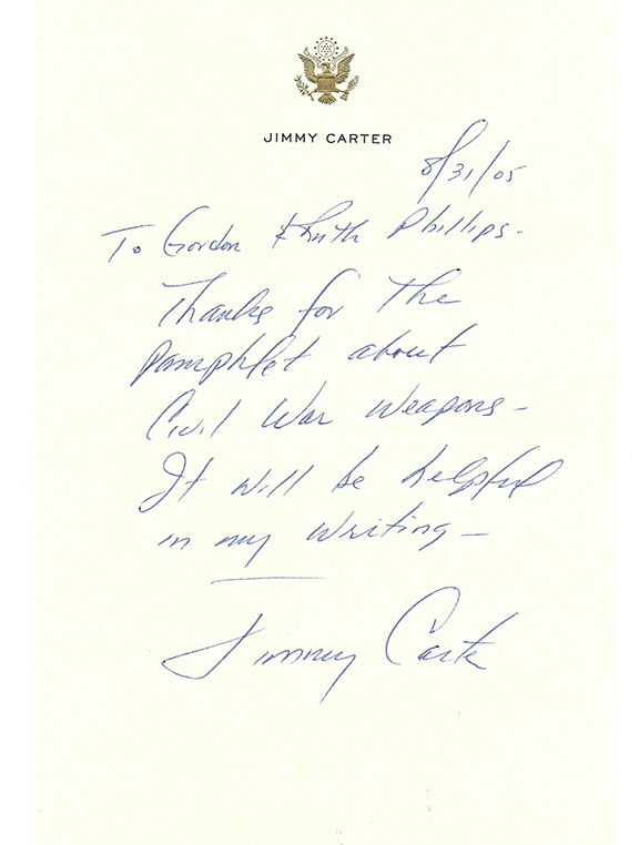 29. CARTER, Jimmy Autograph letter signed, one full page, on his name imprinted letterhead along with the gold embossed seal of the presidency. Carter writes: “8/31/05 To Gordon & Ruth Phillips- Thanks for the pamphlet about Civil War weapons- It will be helpful in my writing- Jimmy Carter.” A beautiful example in fine condition...........$1075.00 |