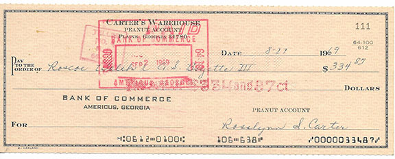 5. CARTER, Rosalynn Autograph document signed. Check on the Carter’s Warehouse, Peanut Account dated 8-27-1969. Made payable in Rosalynn’s hand Roscoe Welch & A.S. Boyette III in the amount of $334.87. Signed “Rosalynn S. Carter.” In fine condition...........$125.00 |