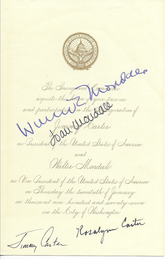 9. CARTER, Jimmy and Rosalynn Carter and Walter and Joan Mondale. “The Inaugural Committee requests the honor of your presence and participation in the Inauguration of Jimmy Carter as President of the United States of America and Walter Mondale as Vice President...” Measures 8.5”x5.5” and bears the seal of the Inauguration of the President and Vice President. Signed by all four with full and vintage signatures. Very fine condition...........$1095.00 |