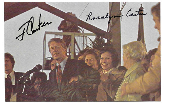 Rosalyn Carter (1927- ) American First Lady (1977-81) author and activist. Postcard photograph of Jimmy Carter speaking in Plains, Georgia Nov. 3, 1976. Rosalyn stands beside him. Signed by both with a vintage signature “J. Carter.”