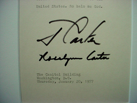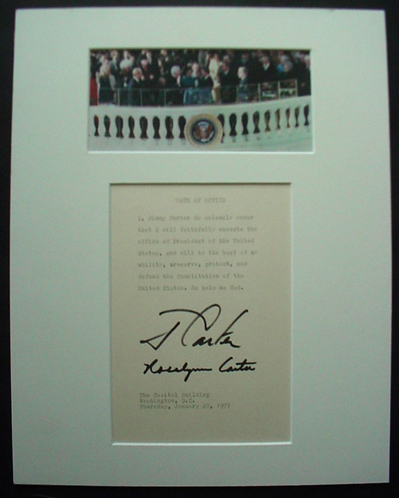Typed document signed, The Capitol Building, Washington, D.C. Thursday, January 20, 1977. One page, measures appx. 6”x8”. Presidential Oath of Office very boldly signed by J. Carter and Rosalynn Carter. Both signature are unusually large. Matted along with a color portrait of Jimmy Carter being administered the Presidential Oath of Office. Overall size 11”x14”. From a distinguished collection of rare Presidential Oath’s of Office. In excellent condition...................$650.00