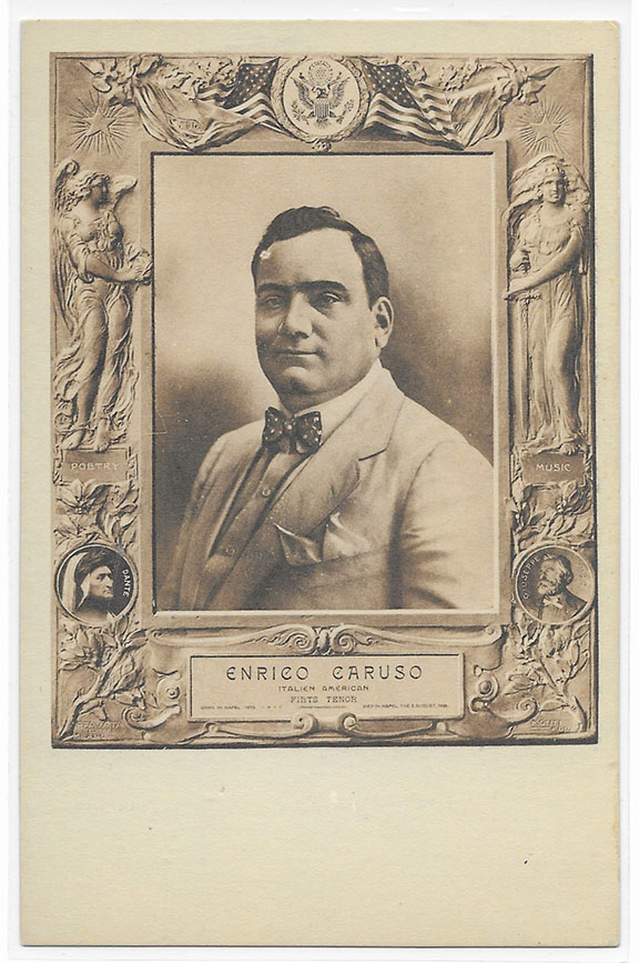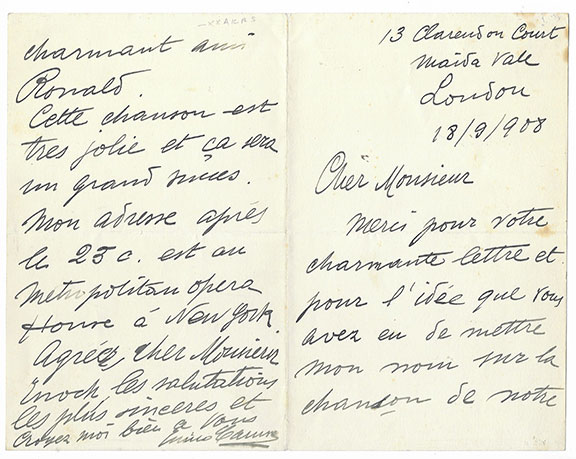 CARUSO, Enrico (1873-1921). Italian operatic tenor who lived to be only 48 years old. He sang to great acclaim at the major opera houses of Europe and America. During his career, he was the most famous tenor in the world. Autograph letter signed, in French, two very full pages, London 18/9/908. Translated: “Dear Sir, Thank you for your charming letter and for the idea that you had to put my name on the song of our friend Ronald. This song is very pretty and it will be a big success. My address after the 25th is at the Metropolitan Opera House in New York. Please accept, dear Mr. Enoch, my most sincere greetings and believe that I am sincerely yours. Enrico Caruso.” Very frameable and in fine condition along with a vintage postcard portrait (1921) made in Italy.....................$850.00