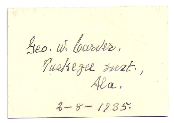 CARVER, Geo. W. (1864-1943). American botanist. Born into a slave family, became renowned for his research into agricultural problems, especially peanuts. Influential teacher and Director of Research and Experimentation at Tuskegee Institute. Fine signature “Geo. W. Carver” adding in his hand “Tuskegee Inst., Ala. 2-8-1935.”.............SOLD![]() |