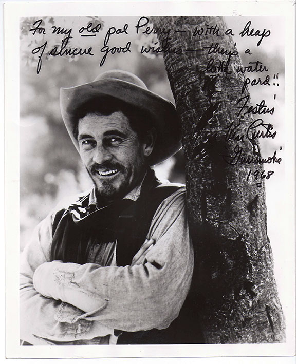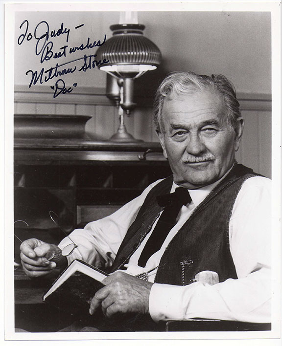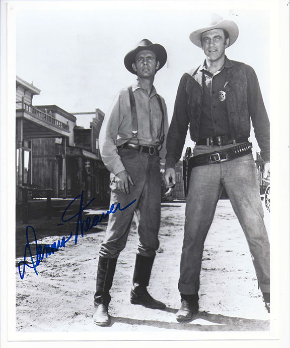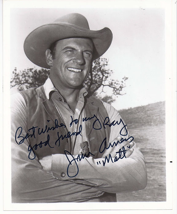 BLAKE, Amanda (1929-1989). Red-haired saloon proprietress known as “Miss Kitty“. STONE, Milburn (1904-1980). Best known as “Doc”. WEAVER, Dennis (1924-2006). Marshall Dillon’s trusty helper. EWING, Roger (1942- ) Part time Deputy Marshall known as “Thad” (Clayton Thaddeus Greenwood. CURTIS, Ken M(1916-1991). Known as “Festus” a scruffy, backwoodsman, hillbilly type. Six, 8”x10” photographs, B&W, all but Thad in their roles in Gunsmoke. Arness: Inscribed, signed in full adding “Matt”. Blake: Inscribed and signed adding “Kittty”. Stone: Inscribed, signed adding “Doc”. Weaver, Dennis: Signed in full. Ewing: Lengthy inscription signed adding “Thad” dated by him 2/27/67. Curtis: Lengthy inscription signed in full adding “Festus, Gunsmoke 1968”. The entire collection is in fine condition and quite scarce as such.................$895.00 ![]() ![]() ![]() ![]() ![]()